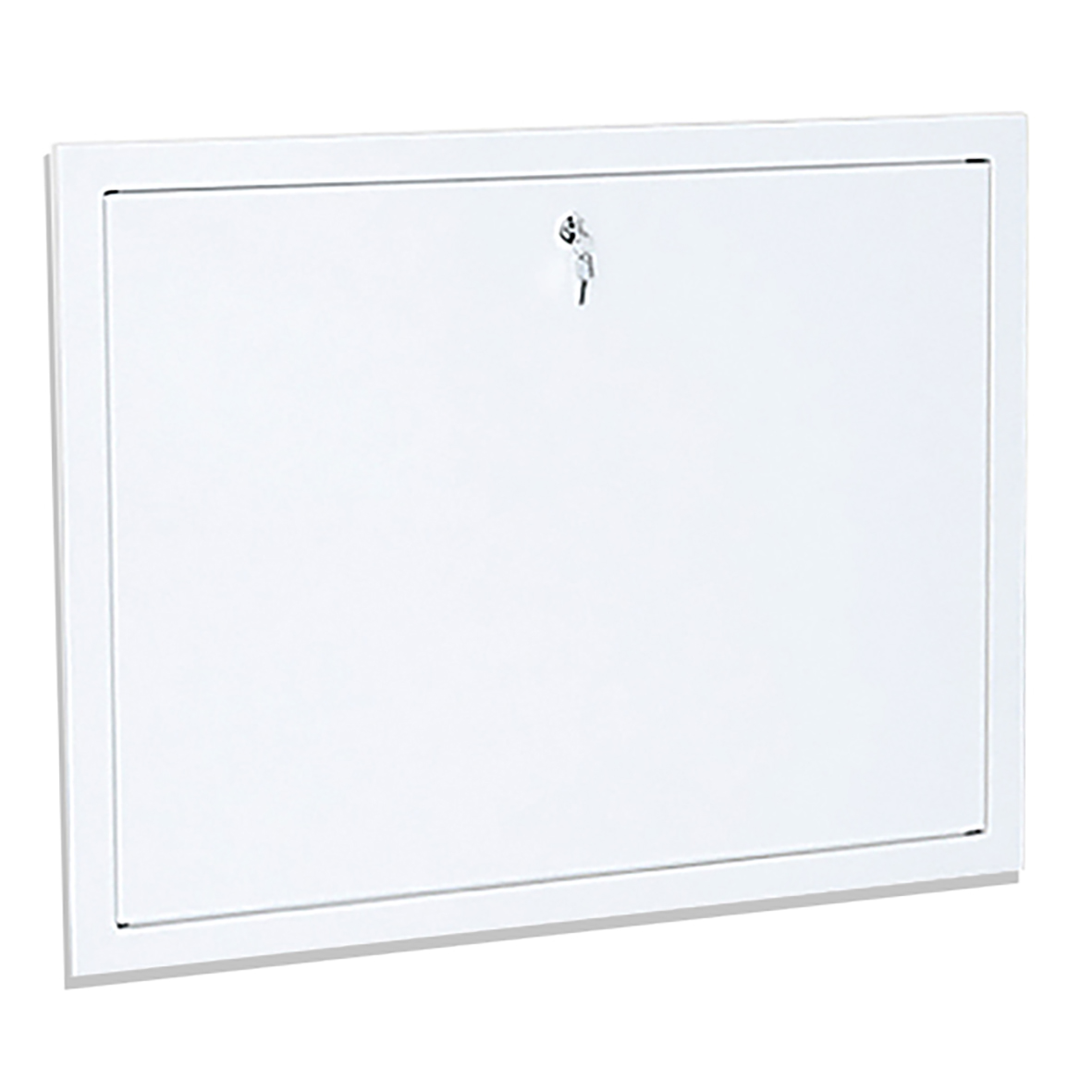 Marco y puerta metálica blanca barnizada con polvo epoxi con cerradura para armario Slim. Espesor exterior 10,5 mm. En el suministro se incluyen 4 tornillos para la fijación al cuerpo del armario.