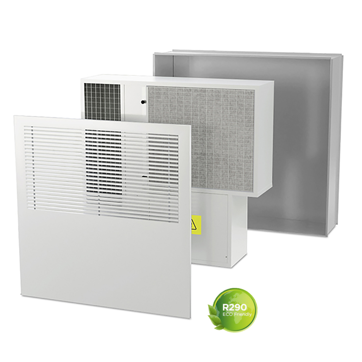 Unità di deumidificazione per installazione a parete (a incasso o da esterno in base agli accessori) composta da circuito frigo, ventilatore centrifugo e batterie di pre e post trattamento da alimentare con acqua refrigerata (15 °C). Gestione con sistemi di controllo RDZ. Refrigerante R290.