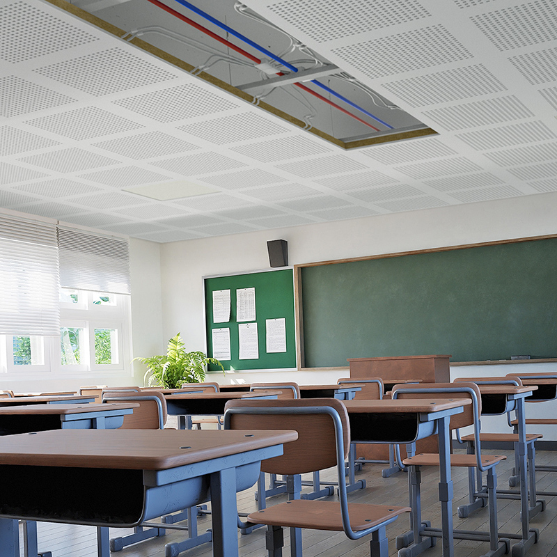 b!klimax Air+ Acoustic è un sistema di riscaldamento e raffrescamento a soffitto, caratterizzato da ottime prestazioni di assorbimento acustico che, unitamente alla bassa reazione al fuoco, lo rendono particolarmente adatto ad ambienti del settore terziario come scuole, mense, auditorium, uffici e strutture sanitarie. Elemento centrale del sistema è il pannello radiante in lana di roccia, conforme ai CAM, dotato di circuiti idraulici da 6 mm e completo di una speciale lastra in cartongesso capace di catturare e neutralizzare gli inquinanti indoor.